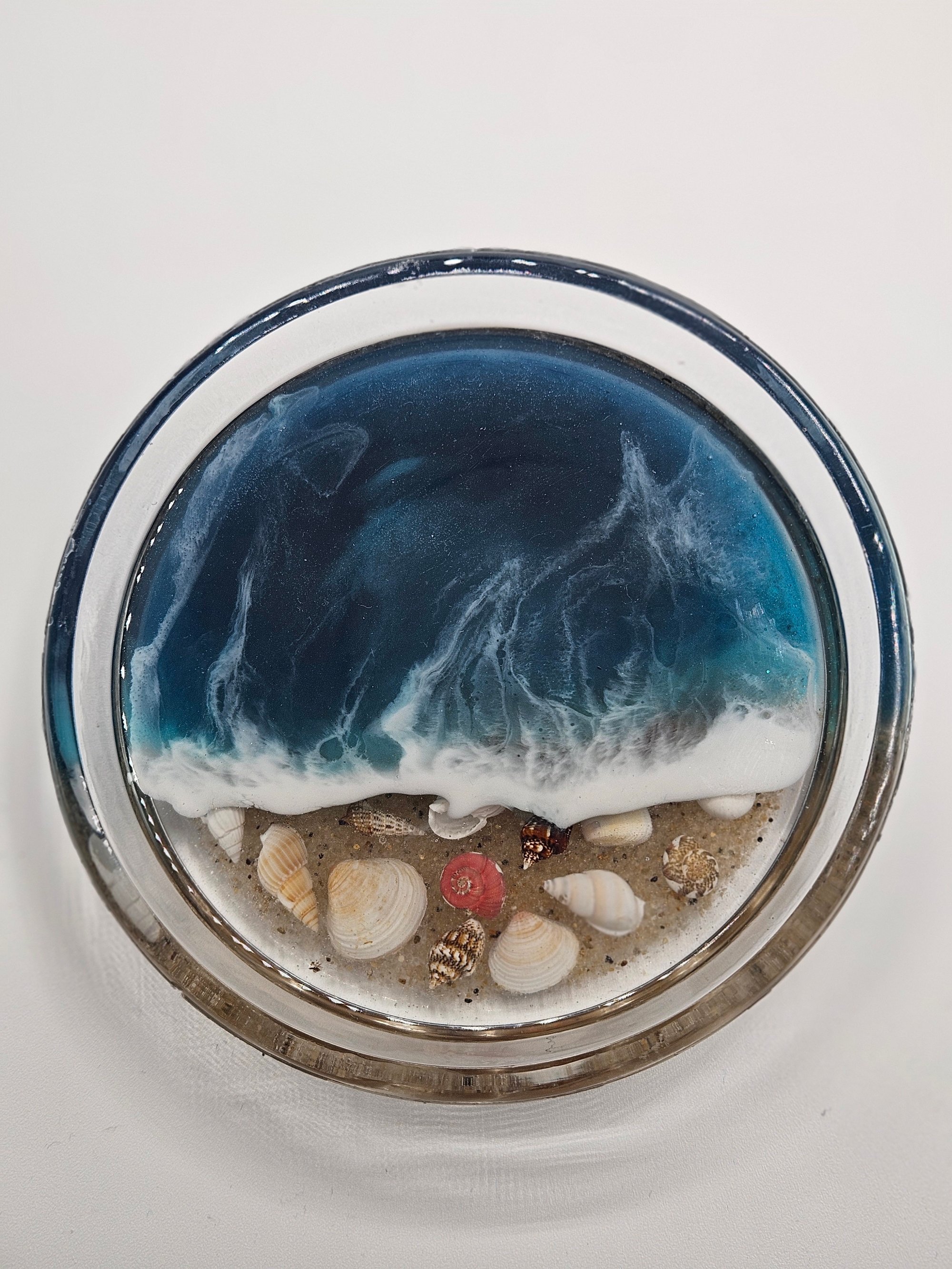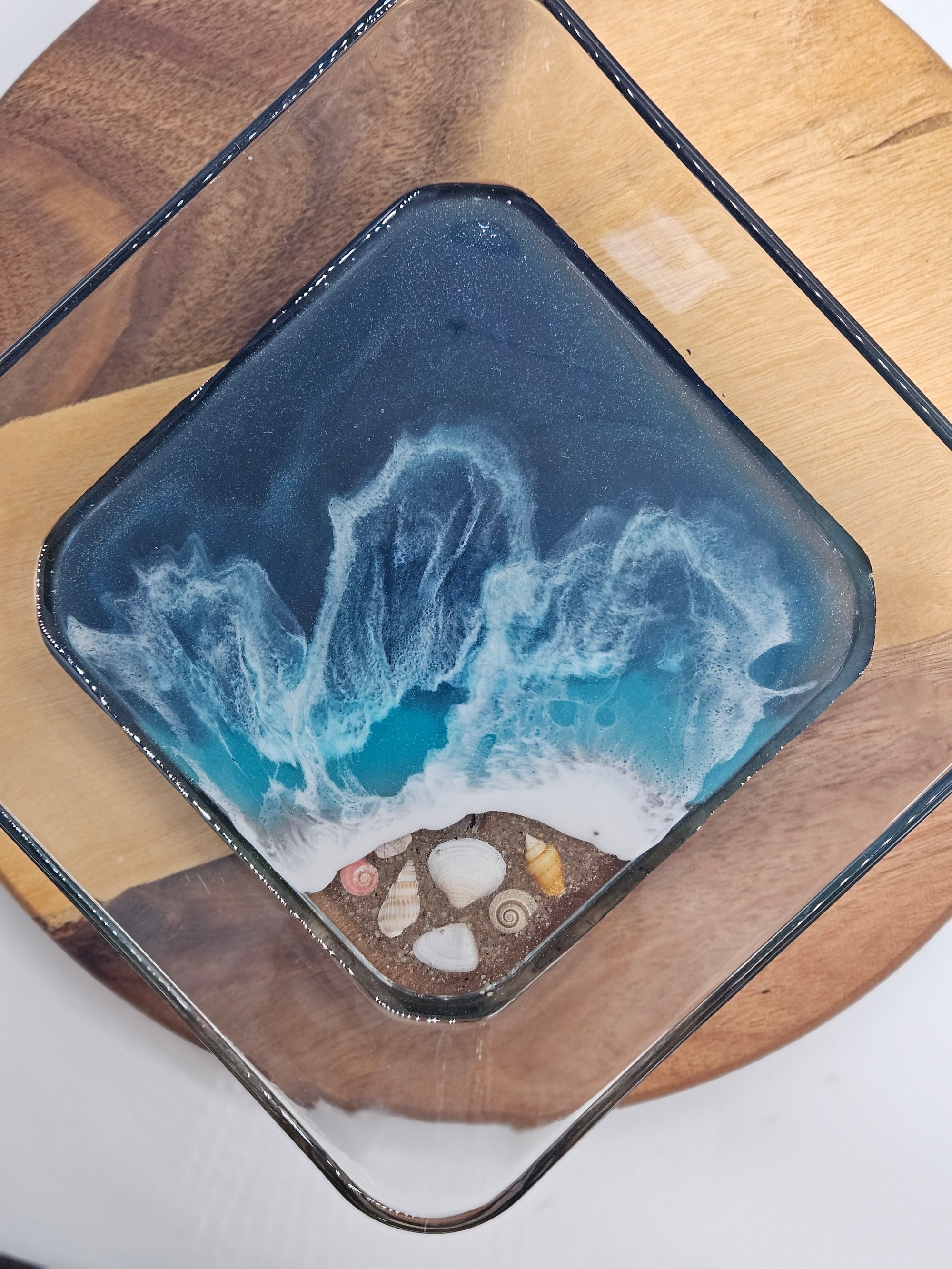 glass trays decorated with authentic cape cod beach sand, florida shells and colored with ocean inspired resin detailing.