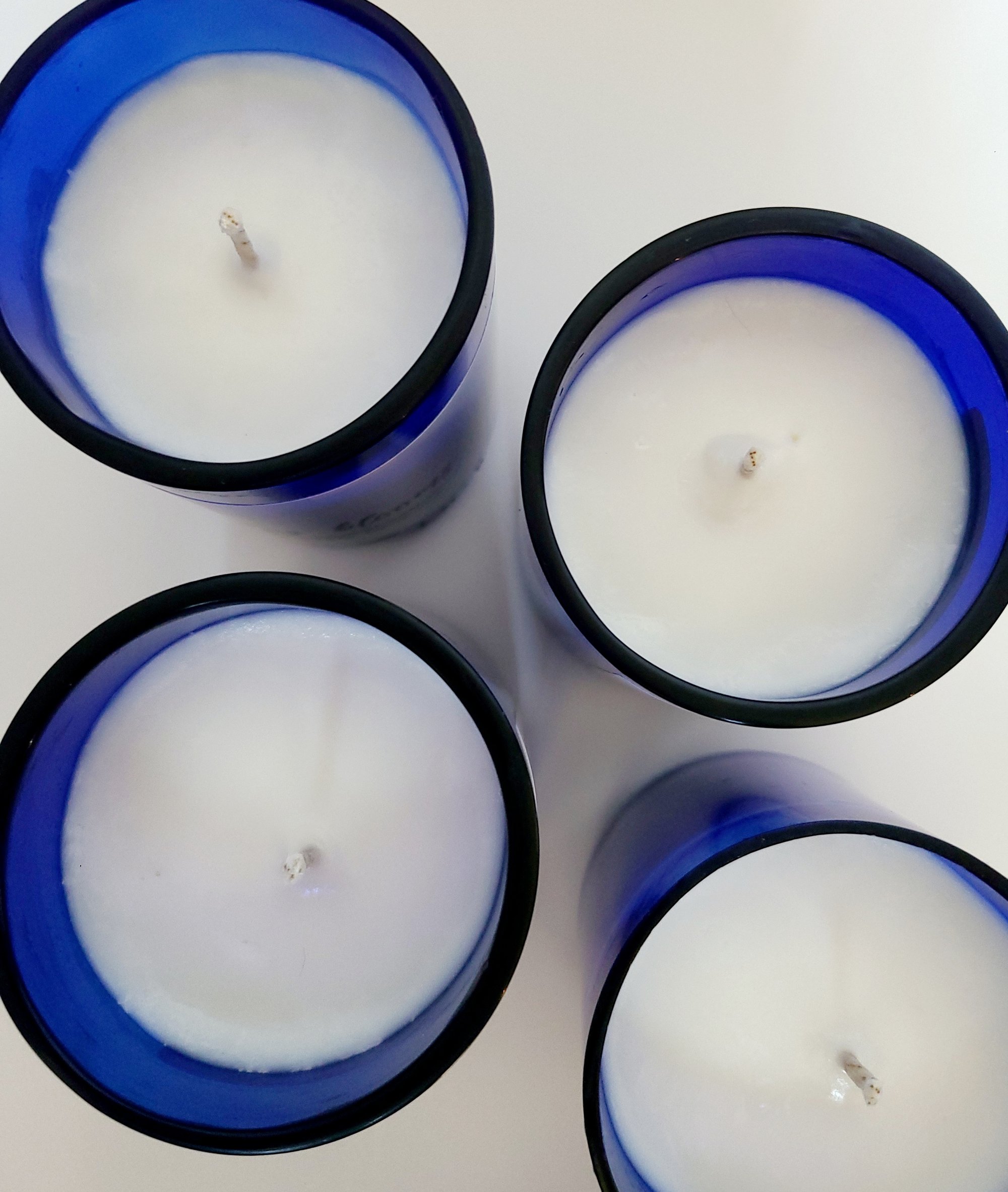 the vessel for this dreamy candle is a cobalt blue wine bottle that has been hand cut, sanded and polished. the candle has been poured with 100% natural soy wax for an eco-friendly, clean burn. each candle is made with non-toxic, natural fragrance oils and a cotton wick.