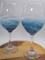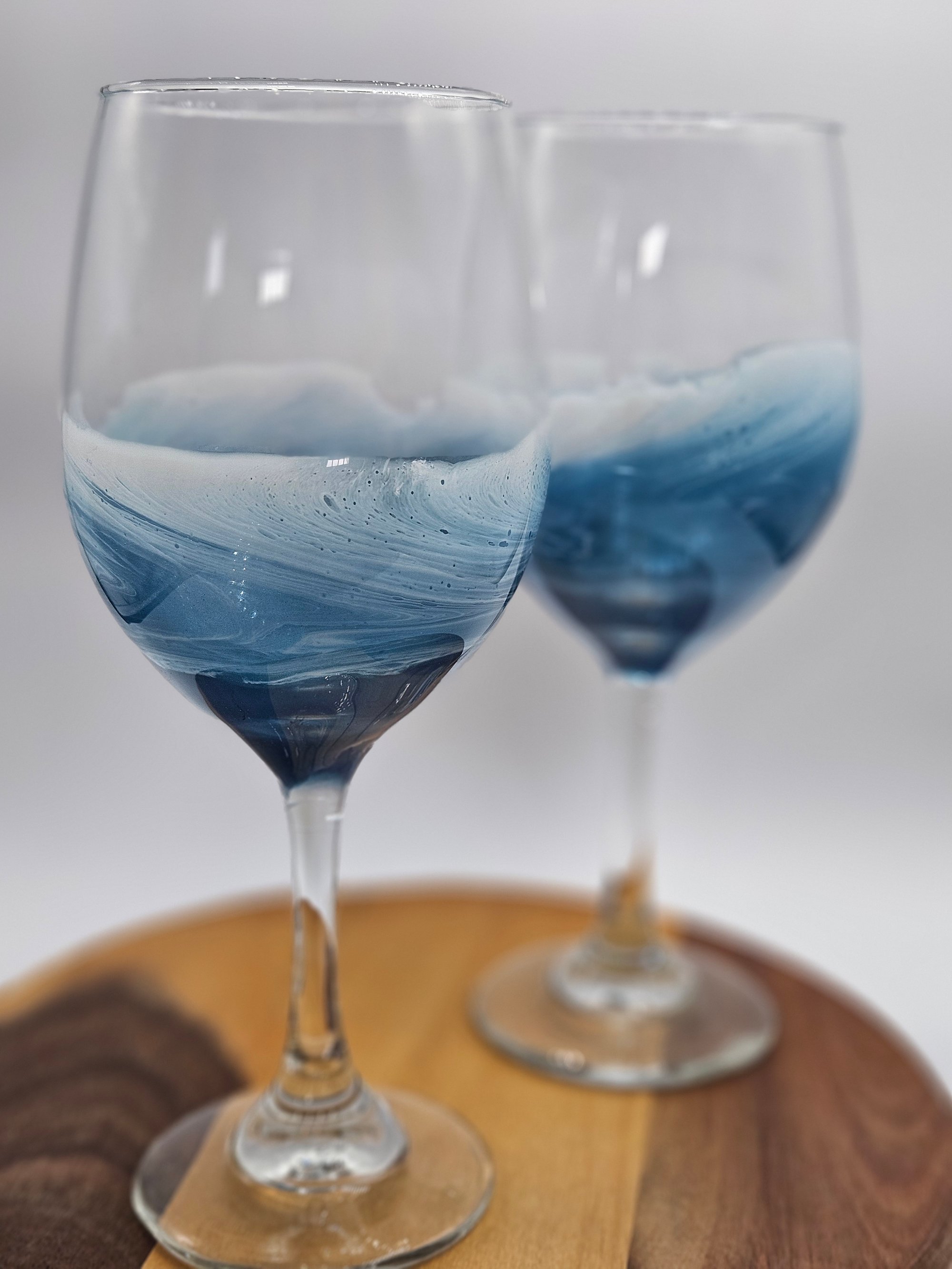 sold as a pair, these gorgeous stemmed wine glasses have been hand painted with ocean inspired resin colors. resin is non-toxic and food safe.
