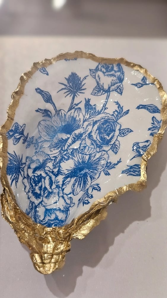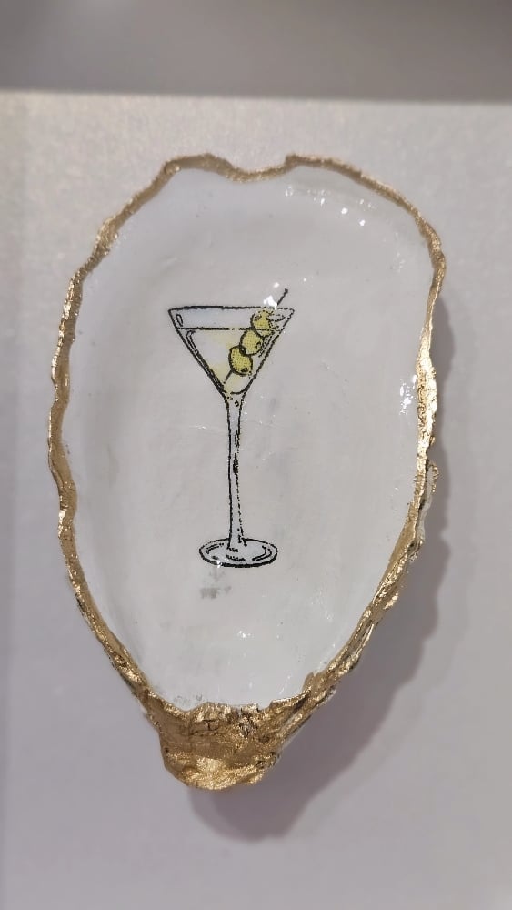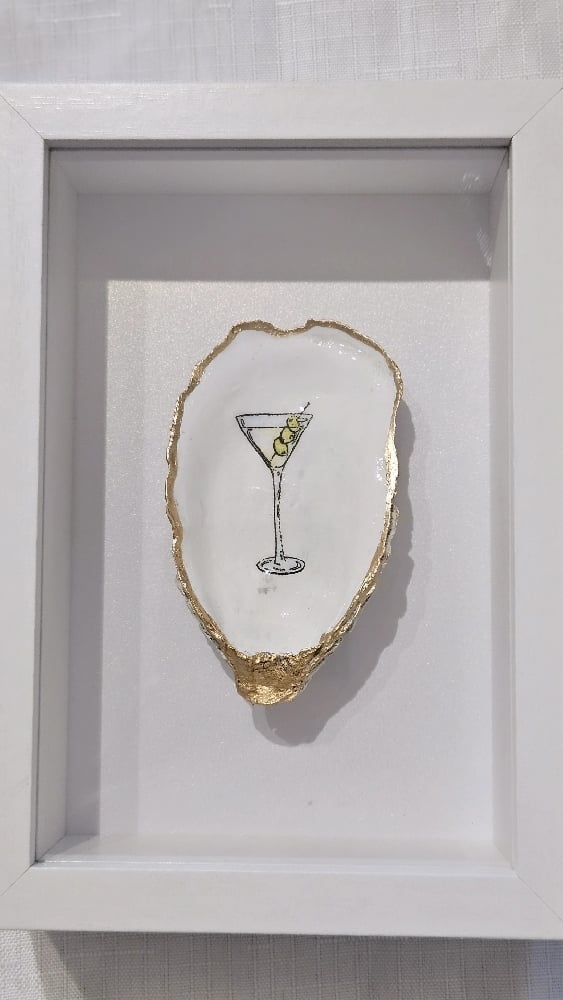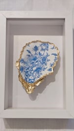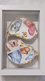 authentic Wellfleet oyster shells that have been decoupaged and sealed with resin, then added to a wooden 4x6" shadow box frame.