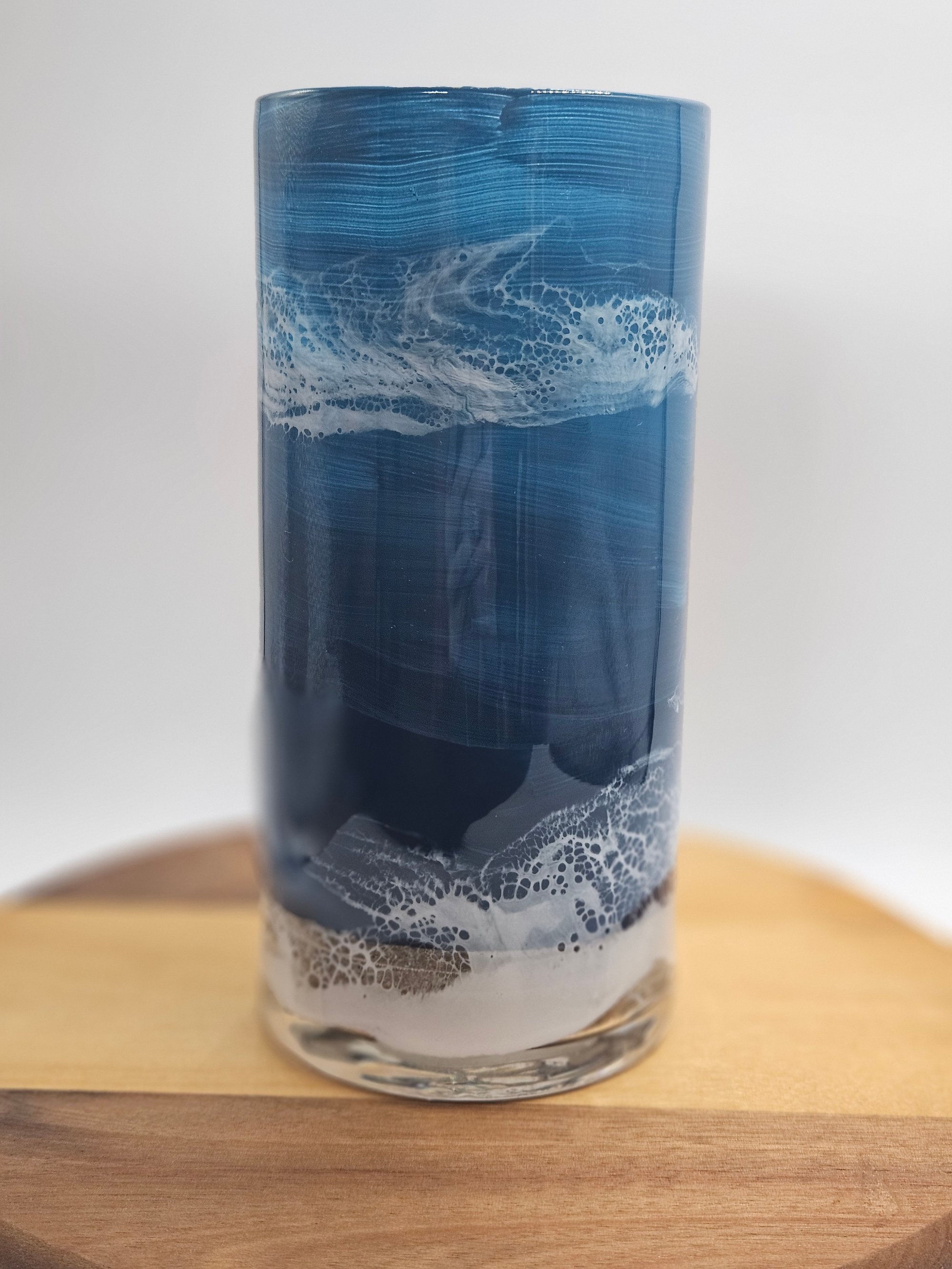 this upcycled vase has been hand painted with ocean inspired blues, white pigment swirled and clear resin sealed for a high gloss shine. inside the vase, an authentic cape cod bay sand dollar has been resined with truro beach sand for added ocean feel!