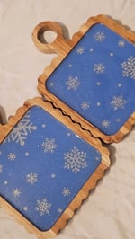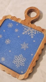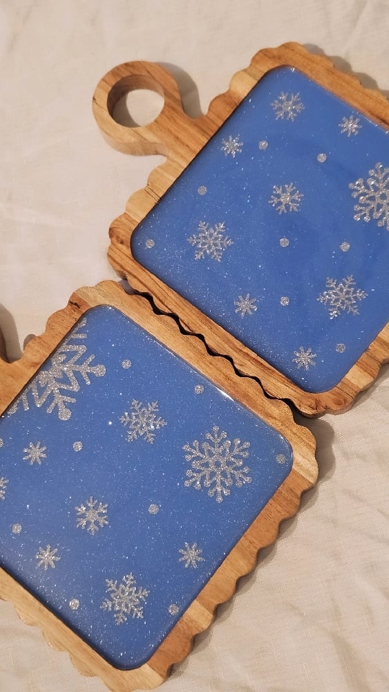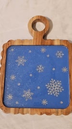 8x8" (plus 3" handle) acacia wood charcuterie board with non-toxic food safe resin design. not suitable for use as a cutting board. this is a serving board for appetizers, etc.