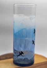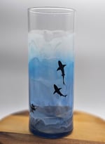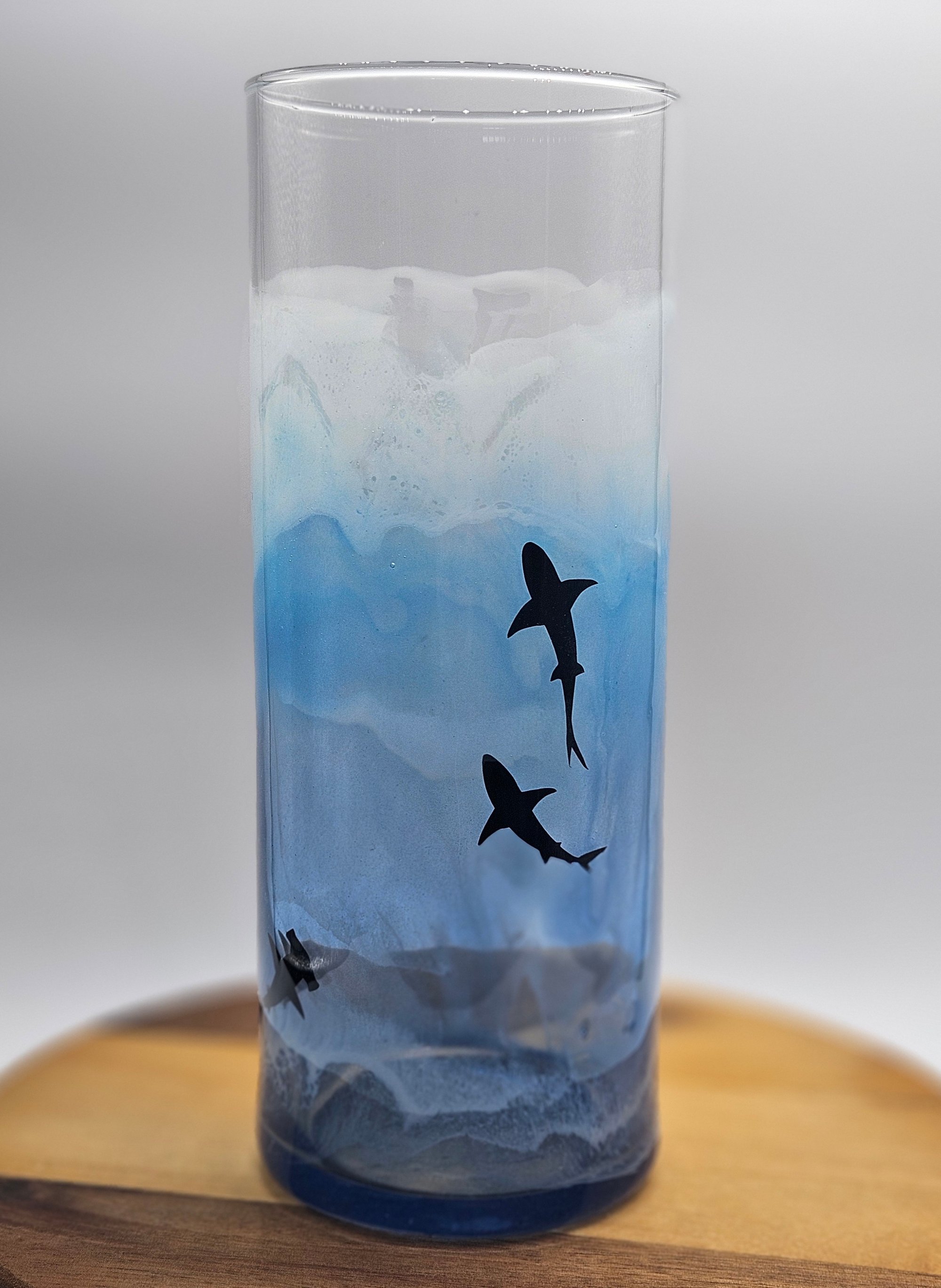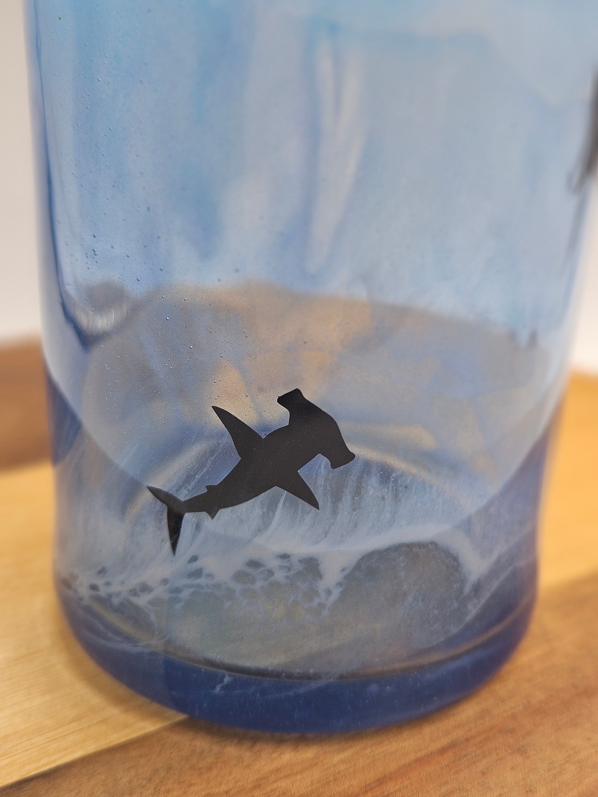 this upcycled vase features swimming sharks within ocean inspired colors and waves. to maintain the design, the vase also has a clear resin top coat.